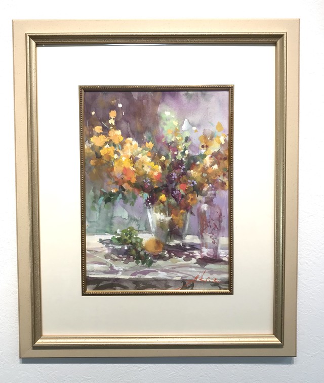 黄色を基調としていながら、落ち着いた色味でまとめているので、飾るシーンを選ばない1枚です。特注のベージュの額縁と金のフレームが絵画の美しさをより引き出せています。