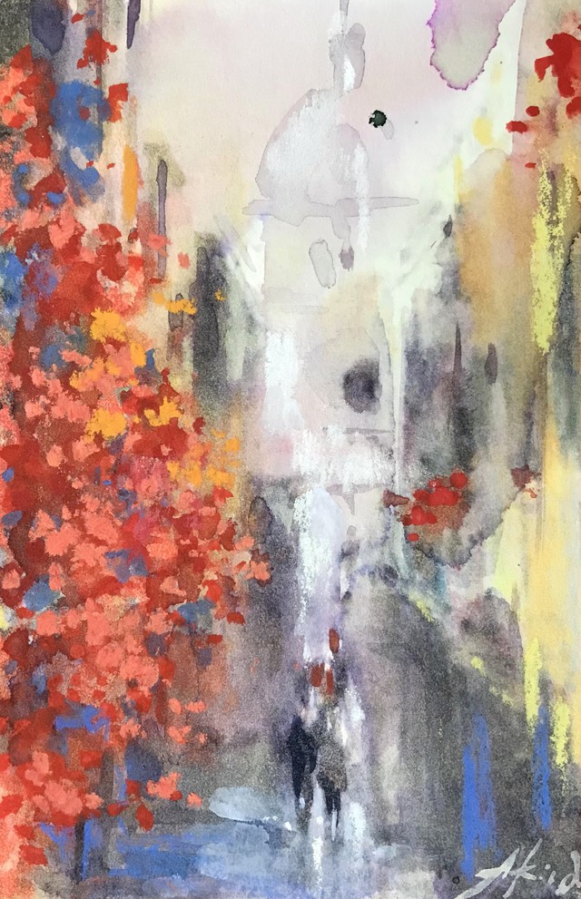 作品名「おしゃべりの道」ハガキサイズ・水彩パステル画 ¥18,000(税込)